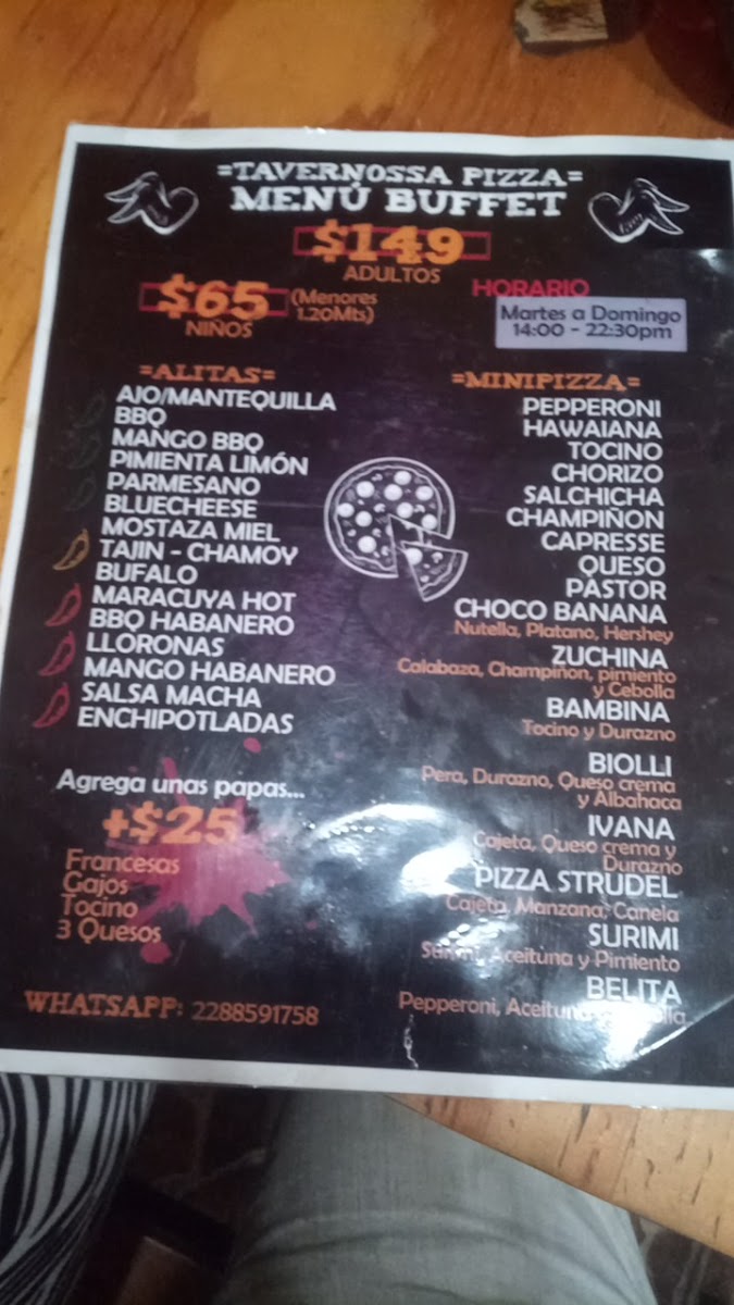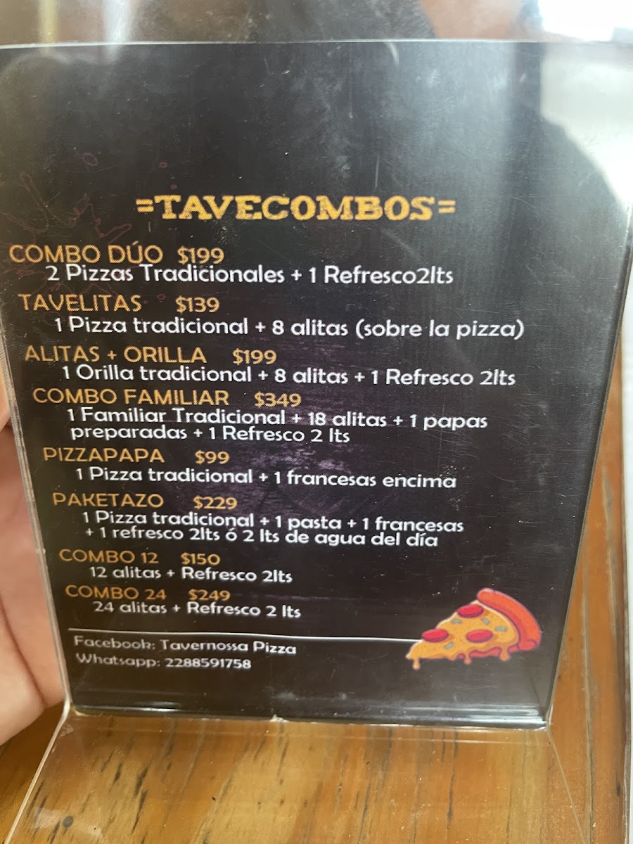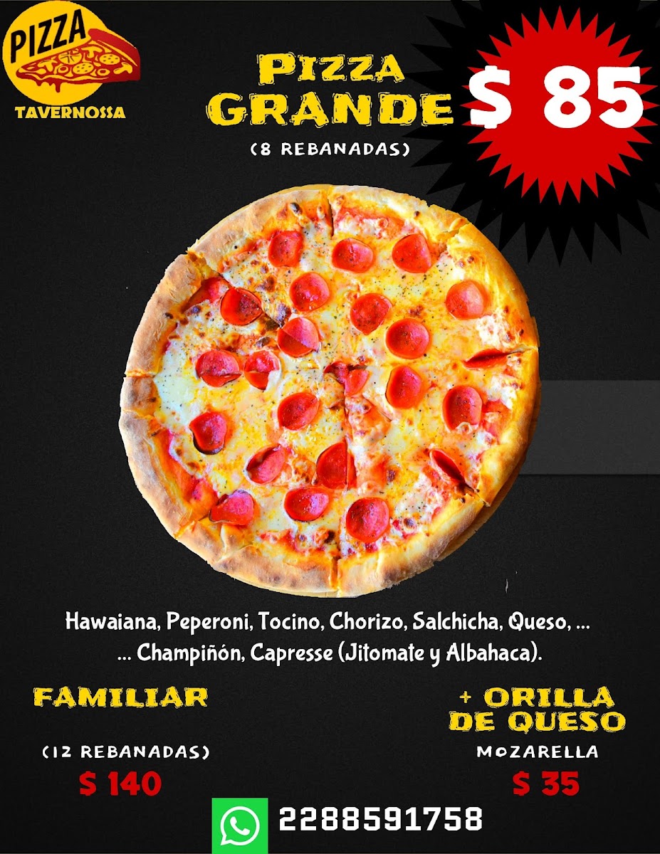 Welcome to Tavernossa Pizza, a charming pizza haven nestled in the heart of Xalapa-Enríquez. With a menu brimming with delightful choices, this pizza restaurant elevates the classic pizza experience. One of their standout offerings is the Papas Preparadas, featuring variations like the savory Papas Pastor with al pastor meat and rich guacamole, sure to tantalize your taste buds for just MX$99.00.